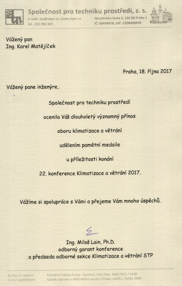 Společnosti pro techniku prostředí za dlouholetý přínos v oboru